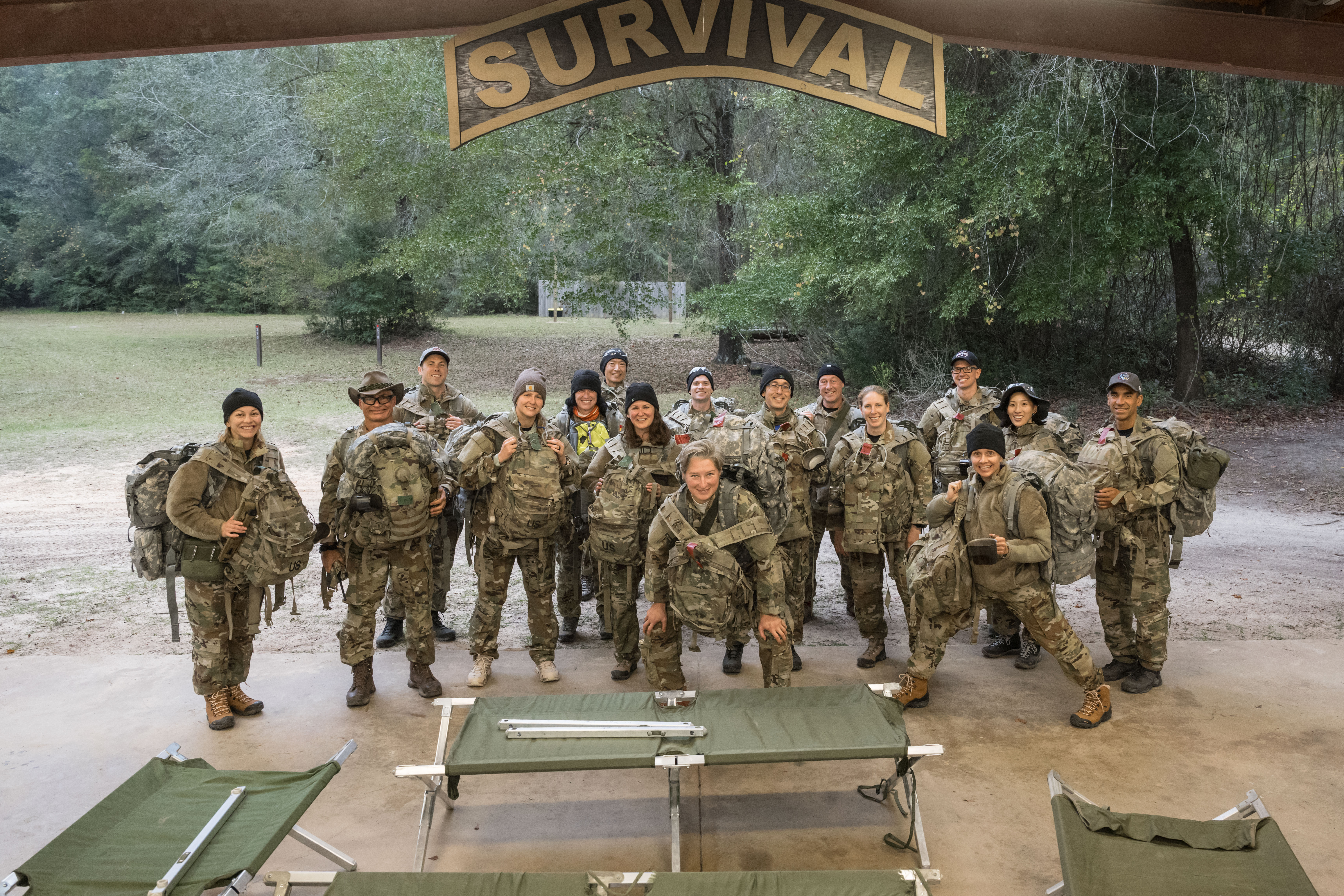 A group of people in camouflage uniforms and large backpacks stand together beneath a wooden “SURVIVAL” sign in a wooded outdoor training area, with green cots and a concrete shelter in the foreground.